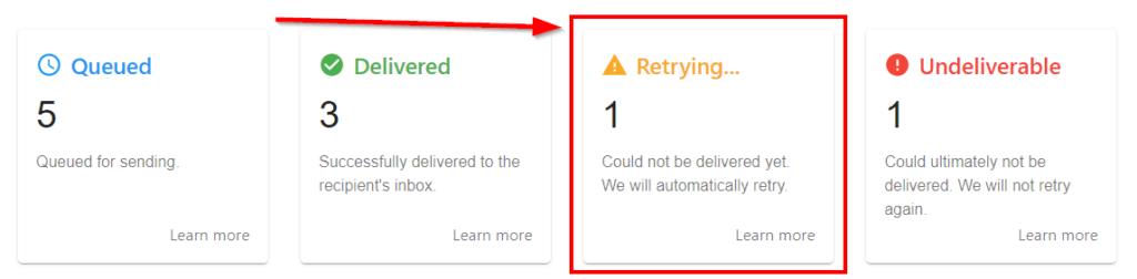 我们会在长达 72 小时的时间内继续尝试发送这些邮件,直到邮件成功发送。此过程无法取消。如果一条邮件持续 72 小时被推迟发送,我们会将该邮件标记为”无法发送”状态。